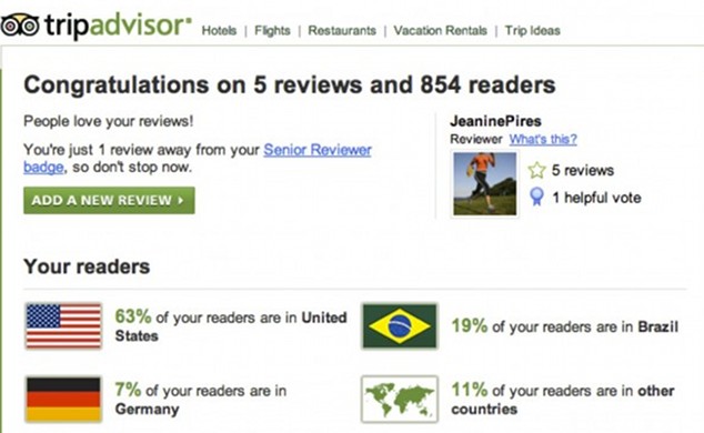 Tenho atuado bastante no TripAdvisor, e sempre recebo relatórios deles sobre quantos usuários leram meus comentários sobre hotéis analisados, e os americanos são campeões nessa leitura (veja na imagem abaixo).